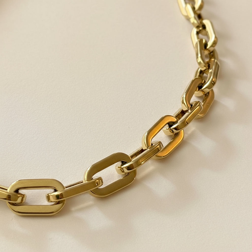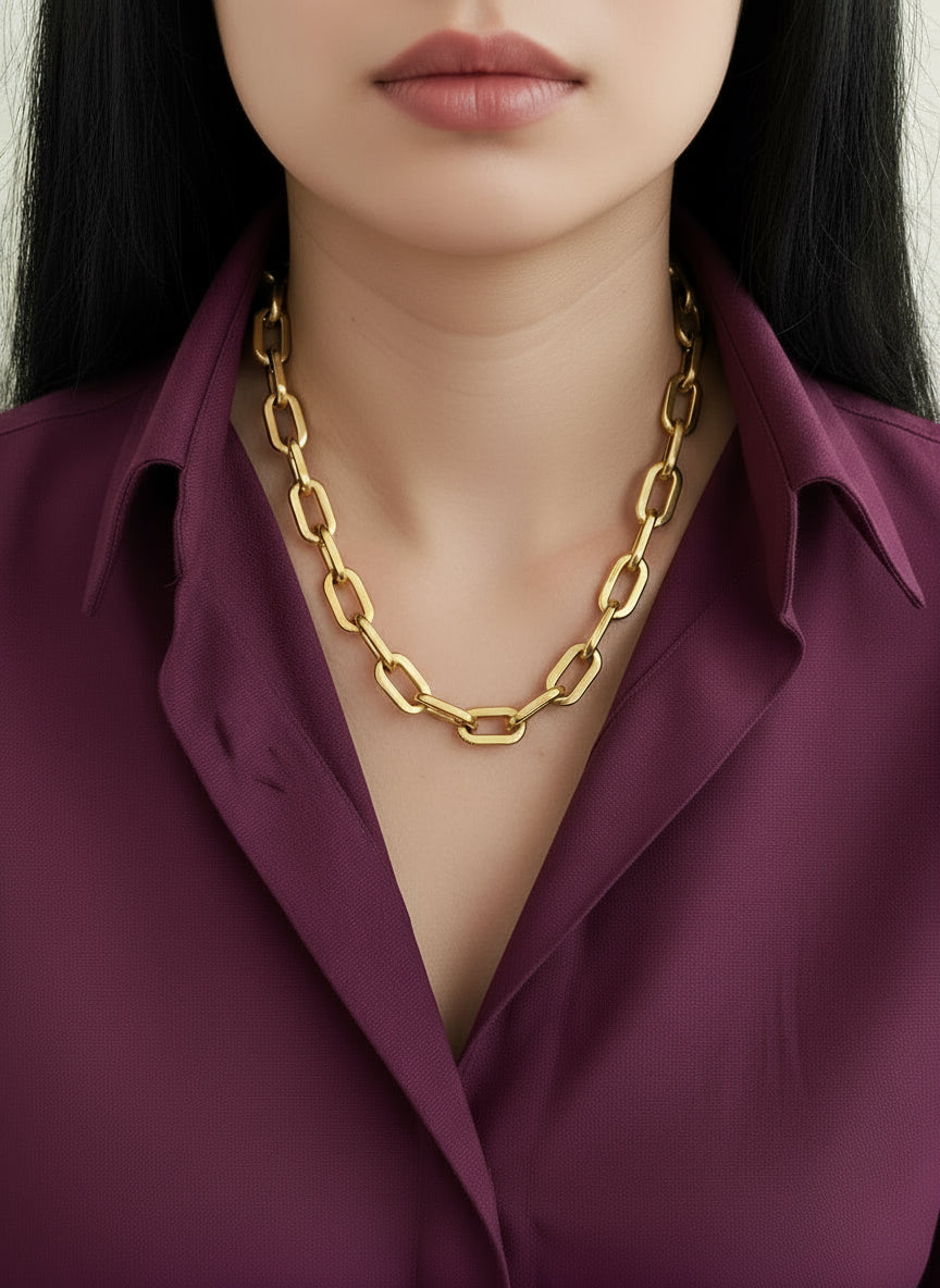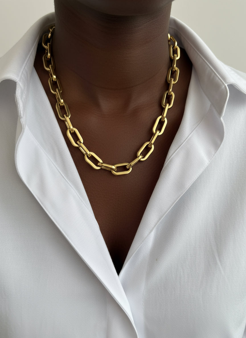 Ce collier au design intemporel sublimera toutes vos tenues. Composé de maillons dorés élégants et modernes, il apporte une touche de caractère tout en restant raffiné.