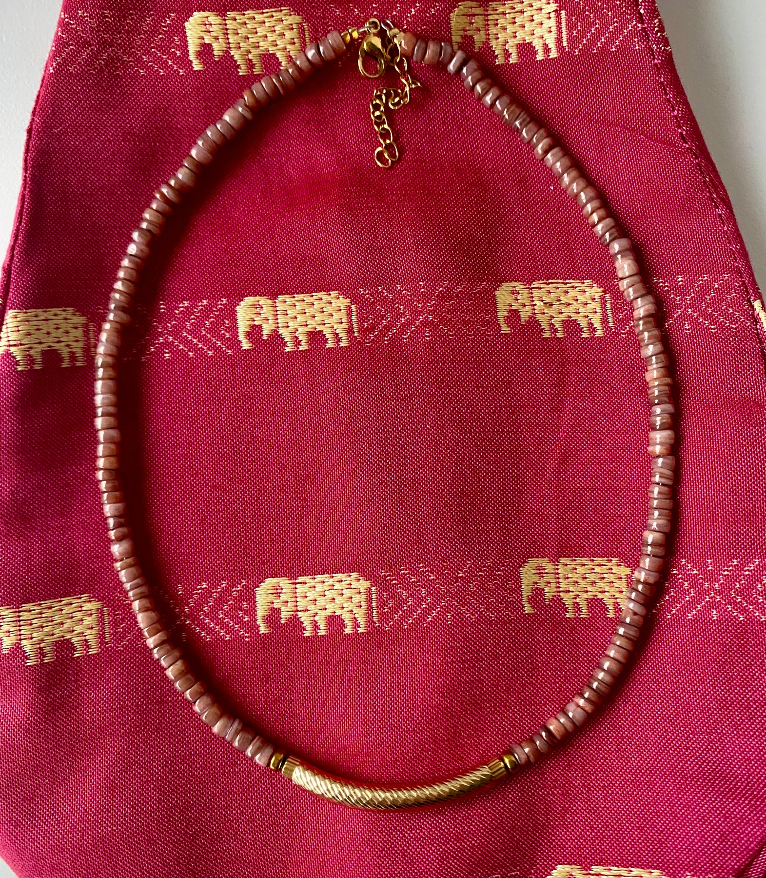 Un collier qui respire la chaleur du bois, sublimé par une touche doré.