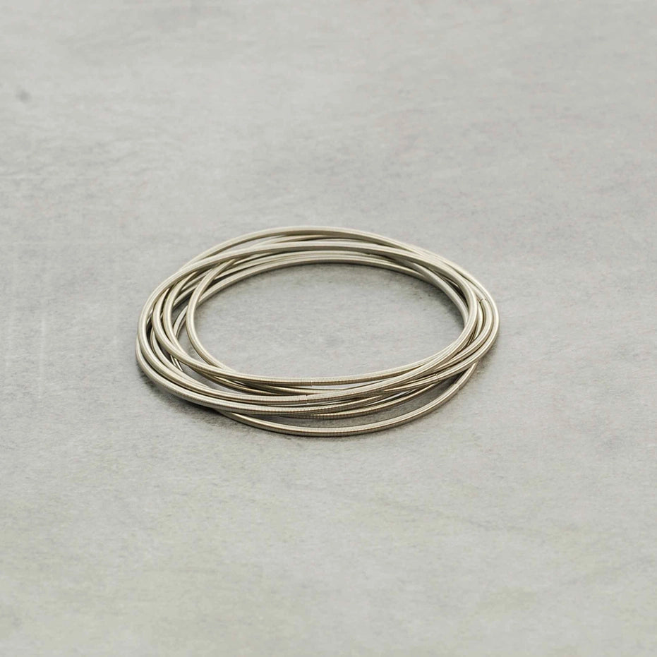 Zilverkleurige veerarmbanden met een strak design in roestvrij staal, ontworpen om samen gedragen te worden.