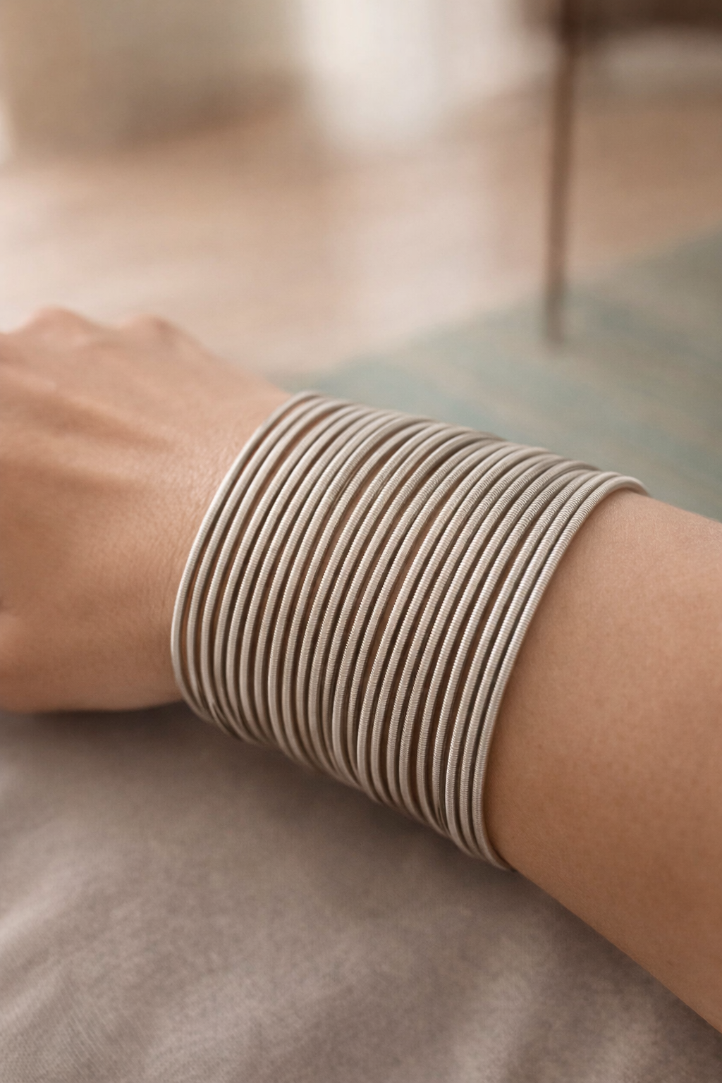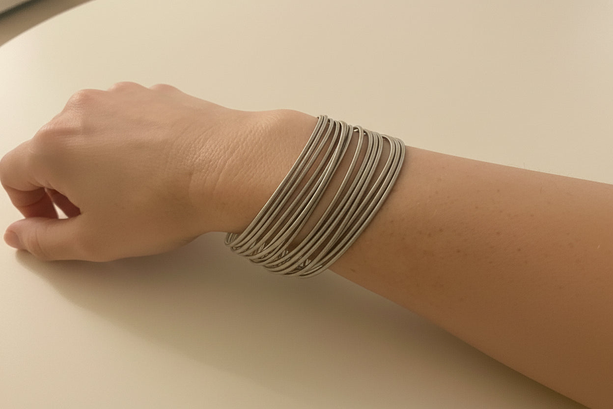 Minstens 14 armbanden, gestapeld, uitgelijnd, vol zelfvertrouwen gedragen.