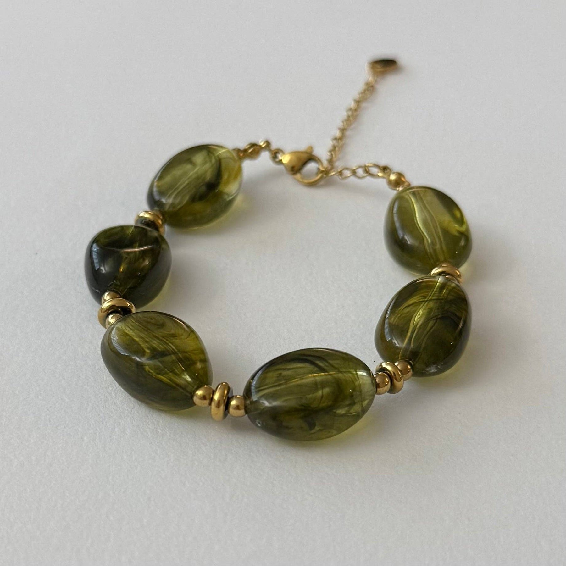 Un bracelet délicat et lumineux, mêlant l’éclat de l’acier inoxydable à la douceur des perles en résine.